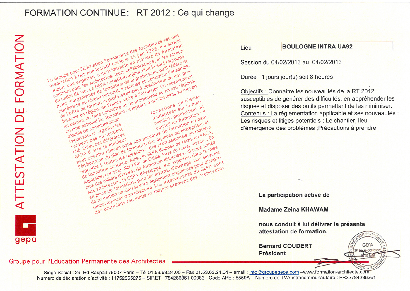 Attestation RT2012 Règlementation Thermique |
