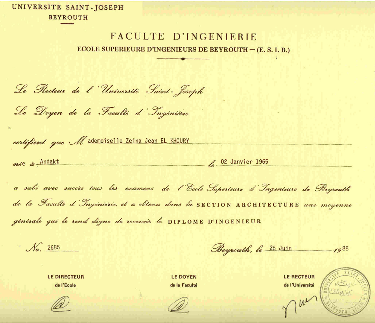 Diplôme de l'ESIB Ecole Supérieure des Ingénieurs de Beyrouth |