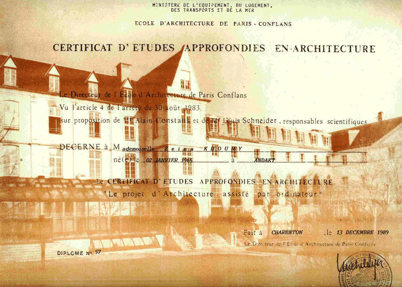 Diplôme de l'Ecole d'Architecture de Charenton le Pont |